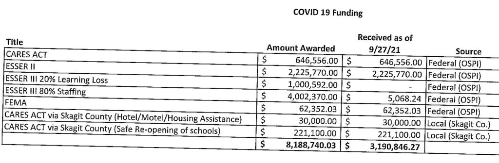 Fig 1. Covid funding sources awarded to Sedro-Woolley School District.