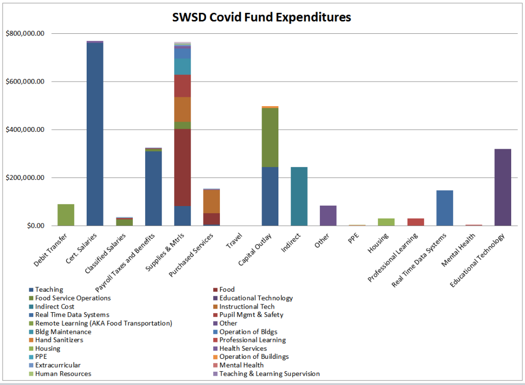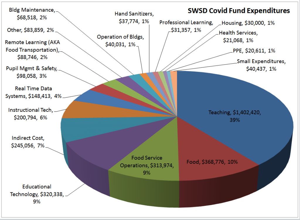 After reviewing Covid fund expenditures I have more questions than answers. I do know that $8.19m is a lot of federal tax dollars. I know that transparency for Covid fund expenditures is extremely lacking from OSPI and especially from Sedro-Woolley School District. I know that accounting categories are not straightforward and it seems impossible to identify what a massive chunk of our tax dollars were actually spent on (i.e. I would not consider “Remote Learning” to be transportation costs). I know that more than $1m has been spent on salaries and benefits, and I am led to wonder how much of this was for education as usual, and what the district plans for the funds typically spent on salaries and benefits. I know that 27 people received housing assistance, but I do not know what qualifications they met for the funds. I know that $221k of CARES ACT funds have been received by the district, but “Not assigned to Exp. Items yet,” which means we can’t see what they were spent on.[24] I also know that taxpayers deserve to see how their dollars are spent, and that is not happening.