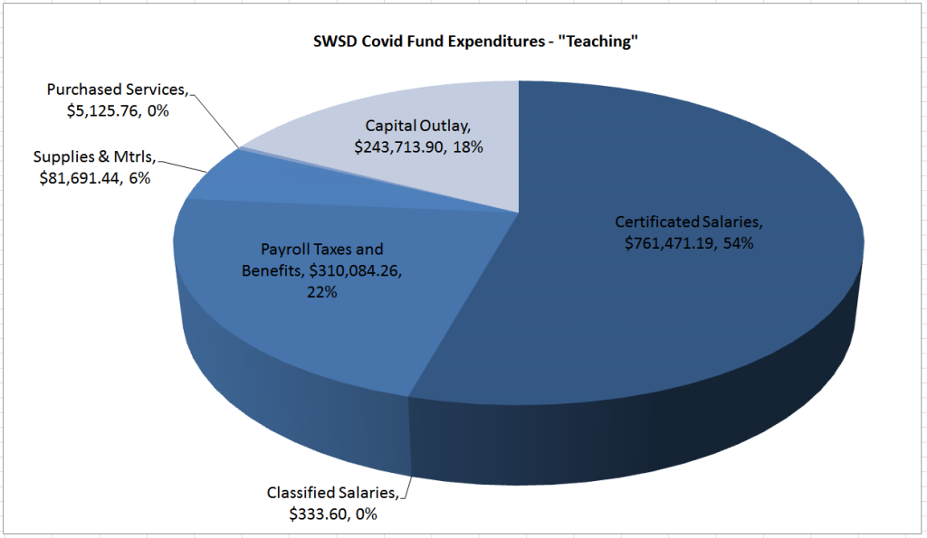 Covid fund expenditures are clear as mud – categories and reporting for ESSER funds are broad and inconsistent. Transparency of information has declined significantly on OSPI dashboards since November 2021, possibly in response to public interest and critique of the alarming funding and stipulations.[10] For example, the ability to parse out “Teaching” spending into relevant categories such as salaries, benefits, supplies, etc is gone. Due to the reporting change, the following expenditures marked “*” do not account for the nearly $600k that have been spent by SWSD since Nov. 2021.