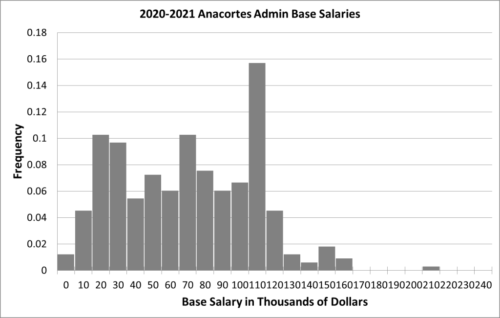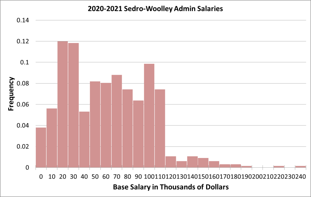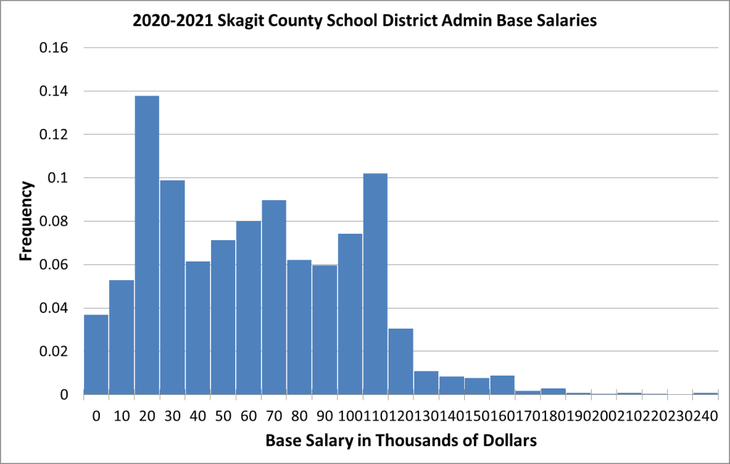 Figure 3. Frequency histogram of all Skagit County School District administrative base salaries from school year 2020-2021 sorted by $10k increments. [12]