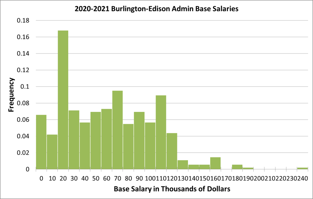 Appendix B. Frequency histogram of Burlington-Edison School District administrative base salaries from school year 2020-2021 sorted by $10k increments. [18]