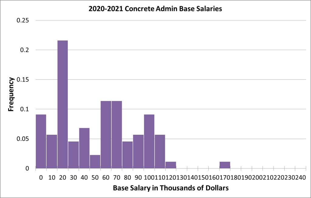 Appendix C. Frequency histogram of Concrete School District administrative base salaries from school year 2020-2021 sorted by $10k increments. [19]