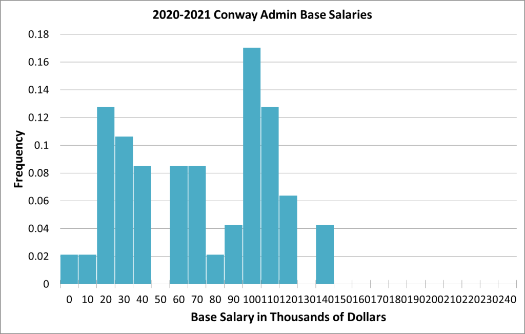 Appendix D. Frequency histogram of Conway School District administrative base salaries from school year 2020-2021 sorted by $10k increments. [20]