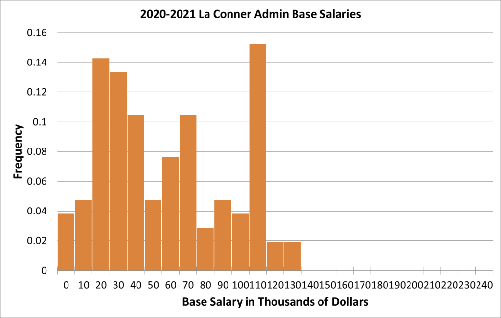Appendix E. Frequency histogram of La Conner School District administrative base salaries from school year 2020-2021 sorted by $10k increments. [21]