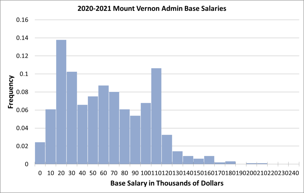 Appendix F. Frequency histogram of Mount Vernon School District administrative base salaries from school year 2020-2021 sorted by $10k increments. [22]