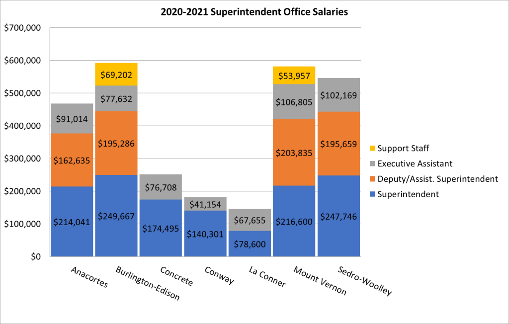 Figure 1. Skagit County Superintendent Office base salaries from 2020-2021, including the Superintendent, Deputy/Assistant Superintendent, Executive Assistant, and other Support Staff in the office.[7]